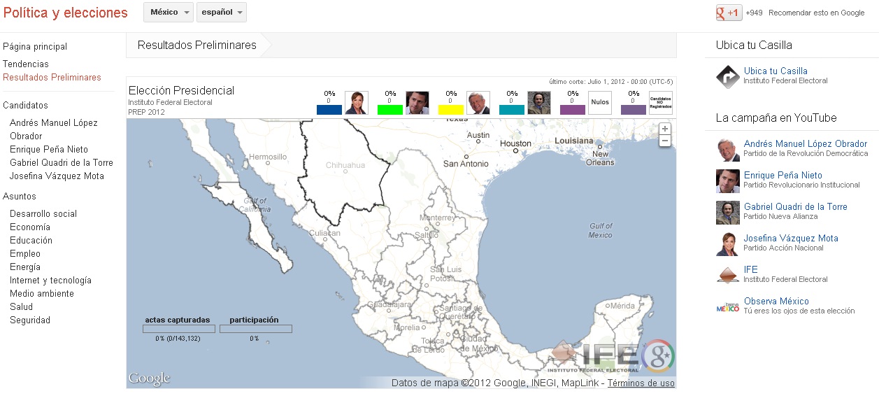 Google elecciones en México hace una coordinación con el IFE para dar seguimiento al PREP del IFE para las elecciones en México.